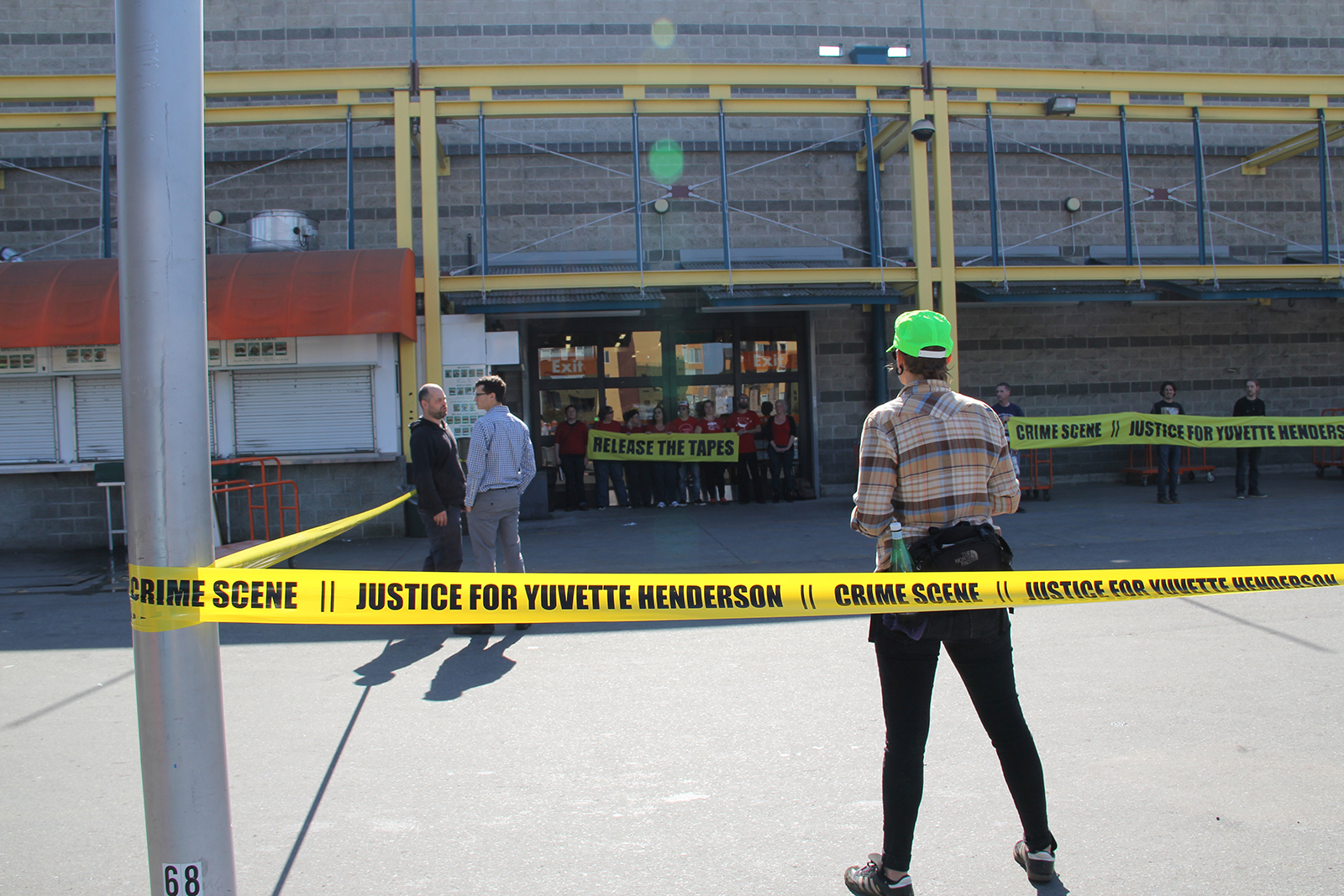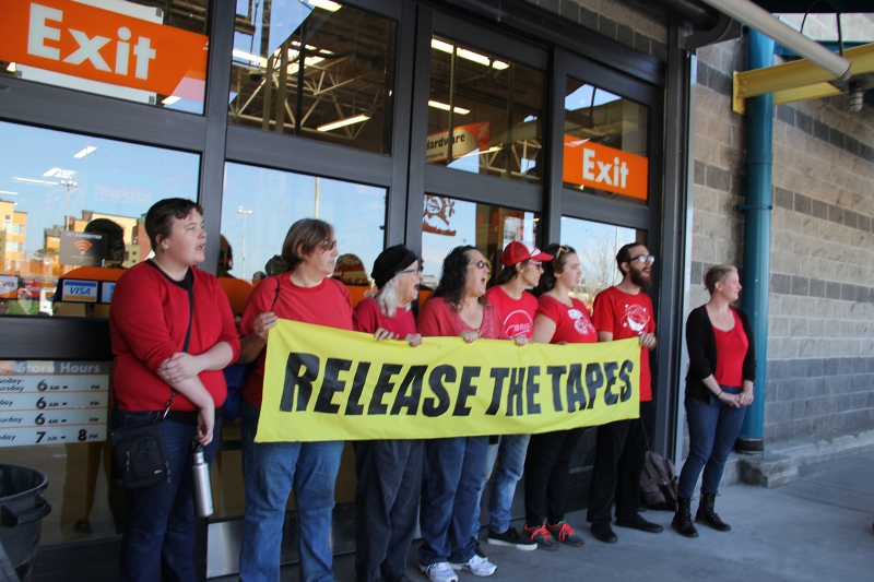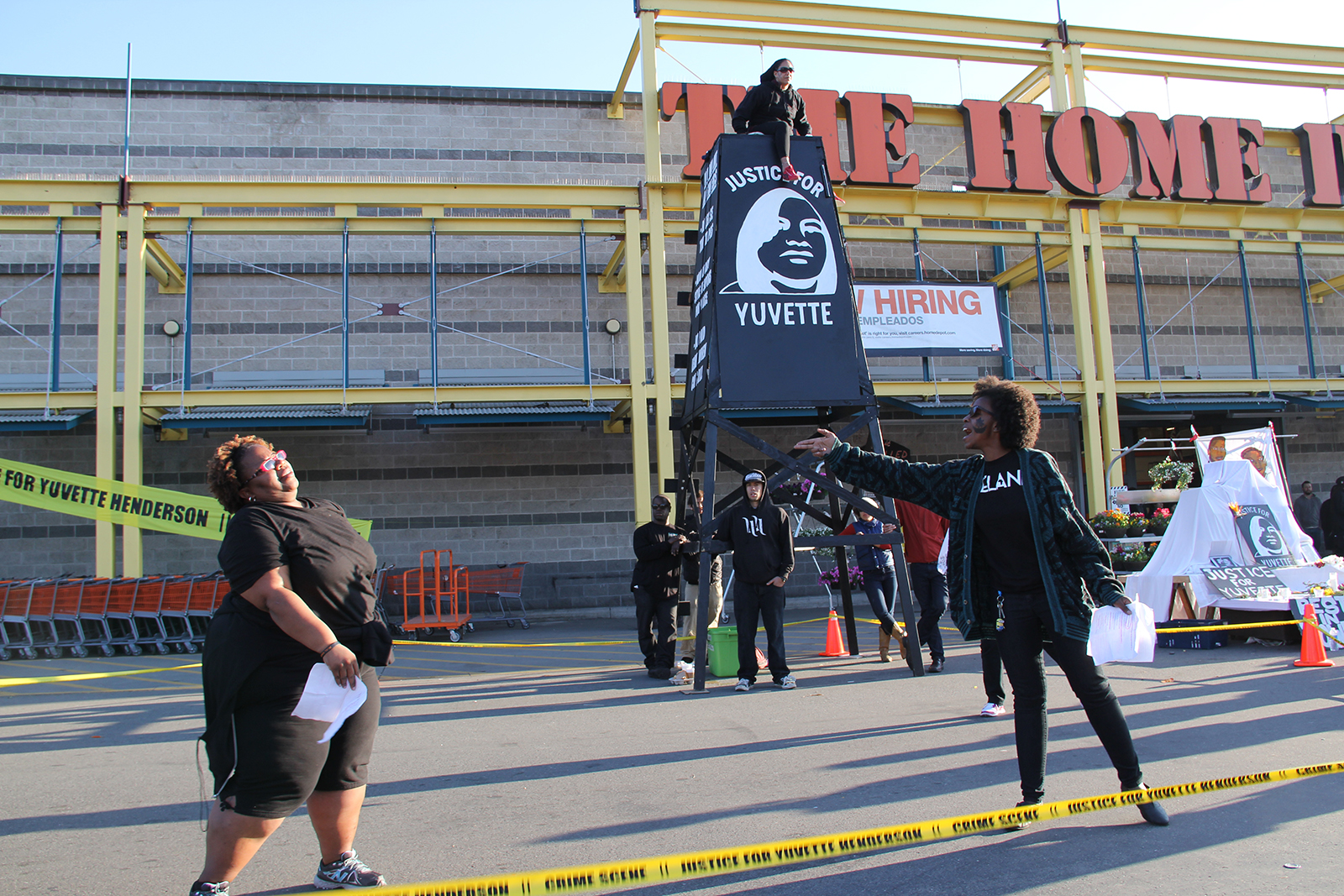 [Photo: Home Depot shut down, with protest derrick and “Release the Tapes / #JusticeforYuvette” banner held aloft by balloon.]