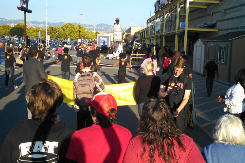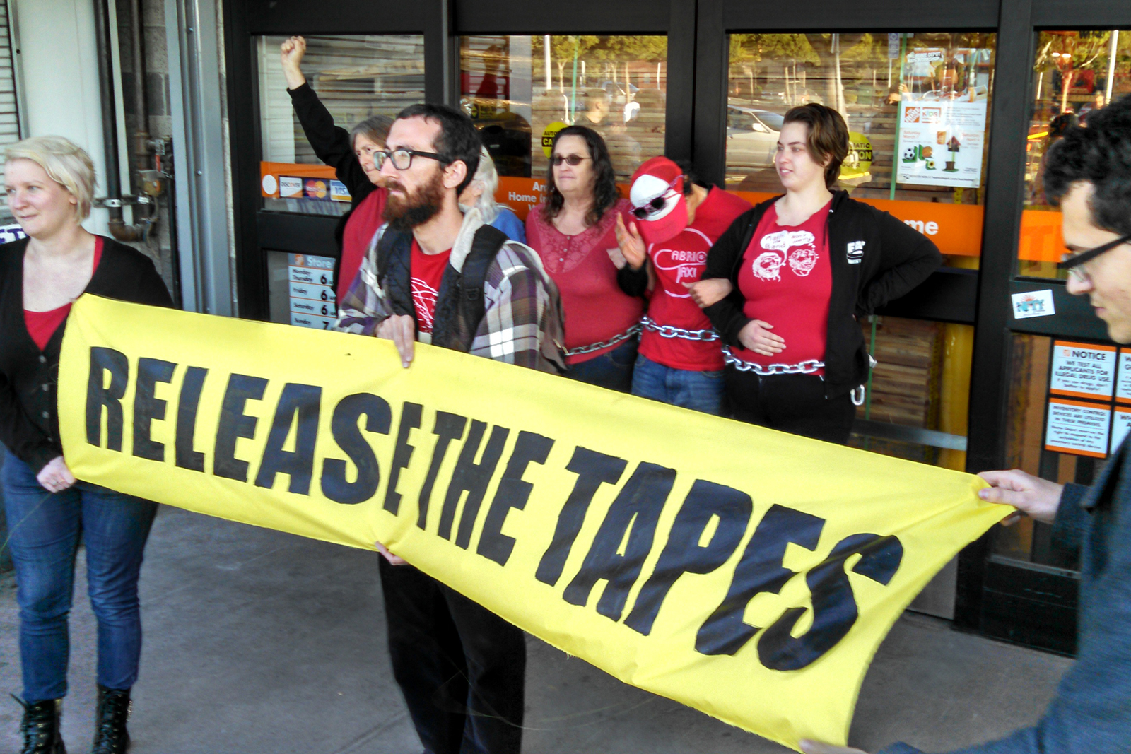 Shortly before the march reached the Home Depot, as marchers headed over the Shellmound Street bridge to 40th Street, another set of activists sprang into action at the Home Depot, locking down across three entrances to the store and setting up an alter for Yuvette, a 20-foot derrick, and hoisting aloft with a helium-filled balloon a huge banner that read “Release the Tapes”. Reportedly, store security freaked out at the time, running back and forth, not sure what to do until it was too late for them or anyone to prevent the lockdown of the store.