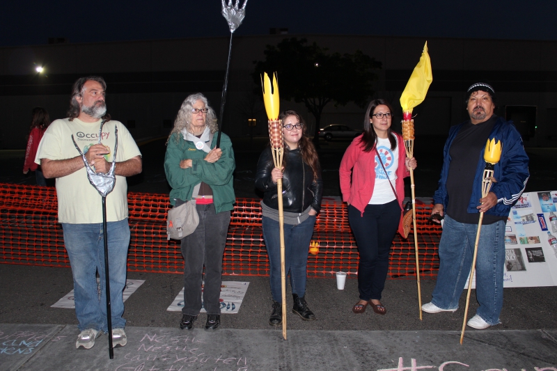 Environmental and human rights activists, holding plastic “torches” and “pitchforks,” formed human barricades at both entrances to the Nestlé Waters bottling plant in Sacramento at 5:00 a.m. on Friday, March 20, effectively shutting down the company's operations for the day.