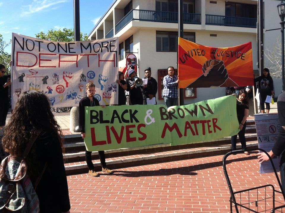 Today we are gathering to raise our voices and fists together to declare that Black and Brown Lives Matter. We are gathering together to continue the struggle that the rebels in Ferguson re-ignited in August, 2014 after Michael Brown was murdered by officer Darren Wilson, and which has spread throughout the United States since then. This is the same struggle that brought people into the streets in Oakland after Oscar Grant was murdered by officer Johannes Mehserle and into the streets of LA when Rodney King was brutally beaten by LAPD.
