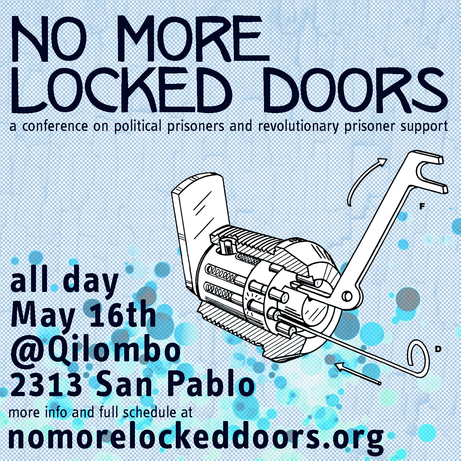 No More Locked Doors invites organizations, groups, and individuals involved with political prisoner support, revolutionary anti-prison organizing, and anti-repression organizing within our struggles to participate in the conference. Tabling by organizations will begin at 11am and go until 6pm and we encourage people who are interested to contact us. Currently we are not charging for tables, but do request that those tabling make a donation to Qilombo to help cover the cost of the space.