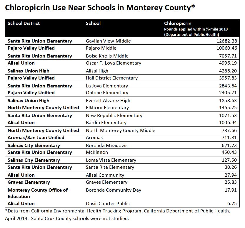 Fumigants are outdated, and a toxic technology that undermines soil health, and safe replacements are needed to grow food on the Central Coast, concludes a new report released by Californians for Pesticide Reform (see PDF). The report examines data that revealed cancer-causing chloropicrin is in the air where Monterey County children live and play, and shares monitoring results that confirm chloropicrin in the city of Watsonville’s air poses an increased cancer risk, despite state required “safer tarps” and "buffer zones". Chloropicrin detections found in Watsonville translate into significantly increased cancer risk for people who live near fields, the report states.