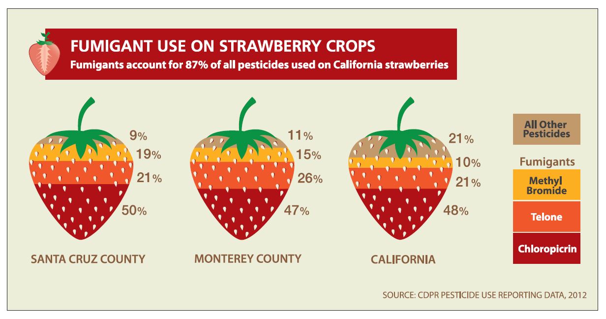 In 2012, Monterey County was the sixth highest pesticide use county in the state, applying more than 9.2 million pounds of agricultural pesticides. Half (50%) of this use came from just five fumigants: chloropicrin, Telone, methyl bromide, metam sodium and metam potassium. That same year, Santa Cruz County applied 1.7 million pounds of agricultural pesticides, with more than 80% of this use coming from the same five fumigants.