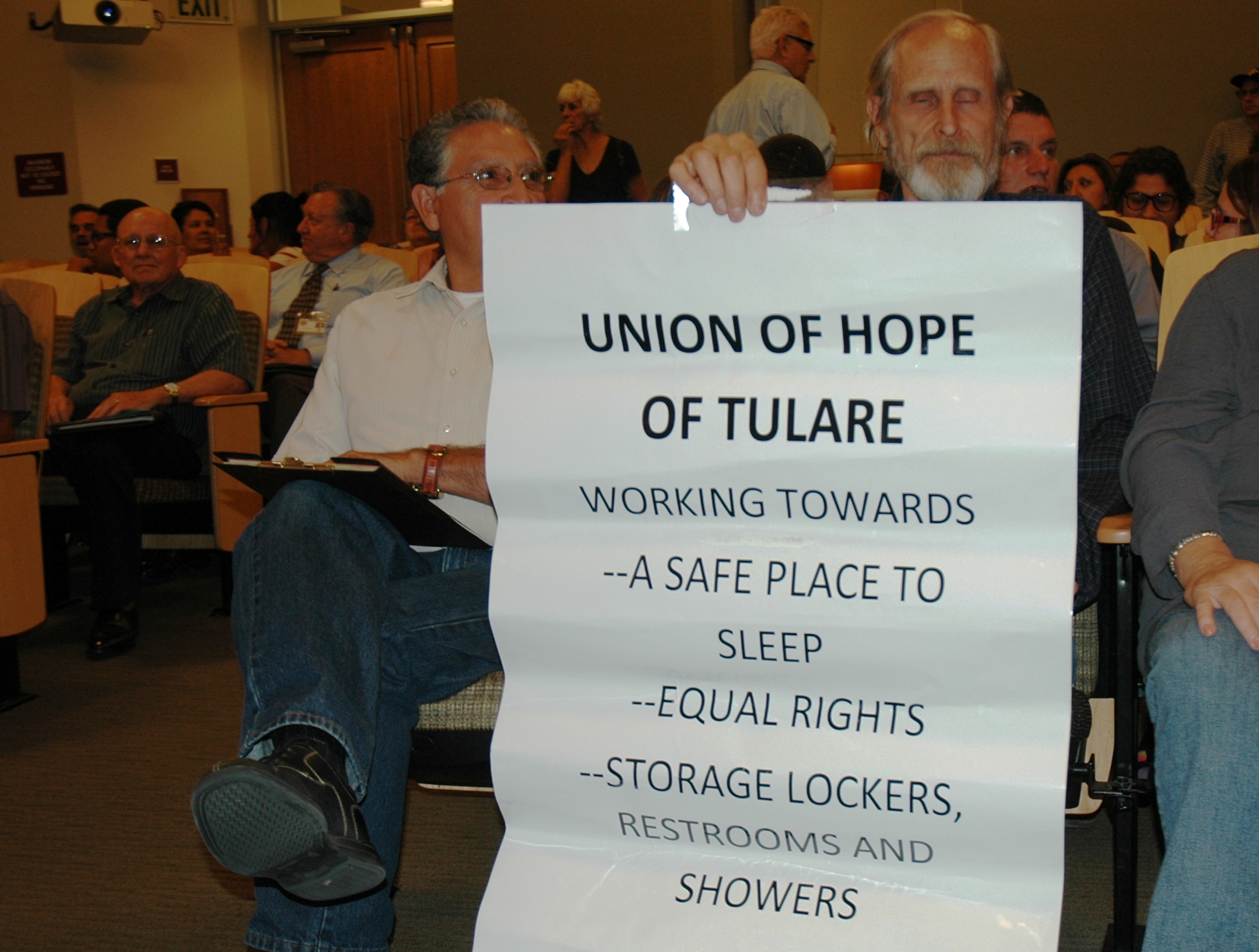 A group of about 100 homeless people and their supporters attended the Tulare City Council meeting last night (Tuesday, April 21, 2015) calling for changes in public policy. The group, which delivered a petition signed by over 1,000 residents, called for improvements in the way homeless people are treated by the police, a safe place to sleep and equal rights.