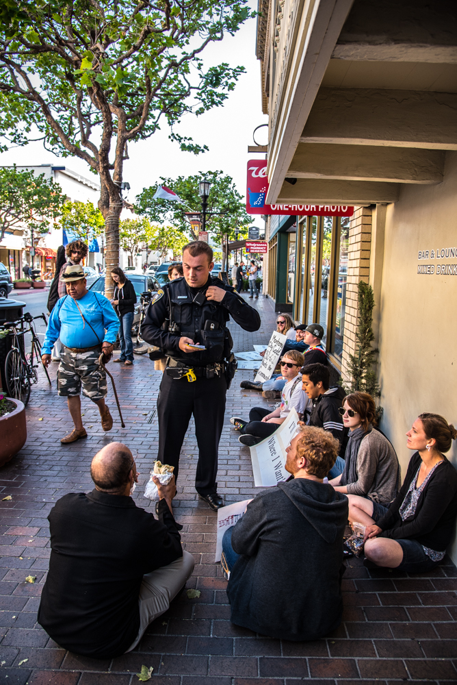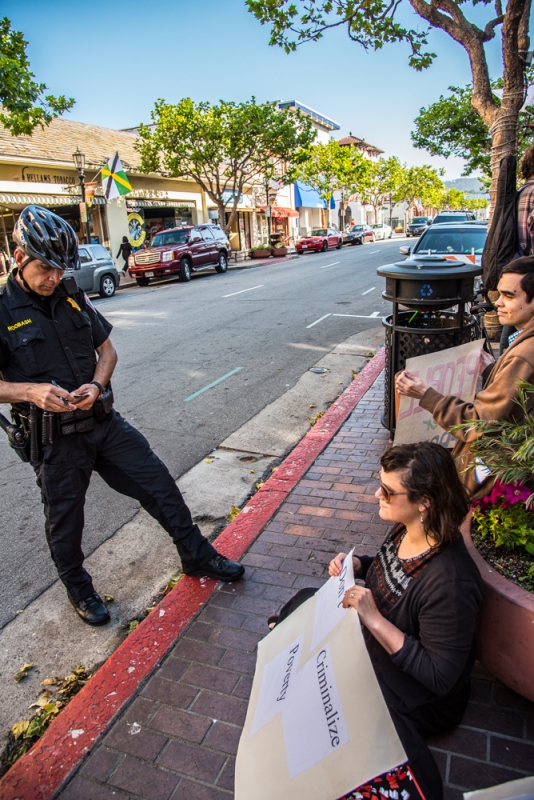Monterey Police have portrayed their enforcement of the city's sit-lie ban as a friendly process where first-time violators are simply given a "warning" when found sitting or lying on sidewalks located downtown and in other commercial districts. On May 1, community members participating in a sit-in held on the sidewalk of Alvarado Street to protest the new law demonstrated the process isn't quite that simple. More than a dozen individuals were confronted by police and forced to give them their name, date of birth, and home address as part of the verbal warning that they were in violation of the site-lie ordinance. For the past several months, community members have been organizing sit-ins to oppose the ban, which they say unfairly targets homeless people and travelers.