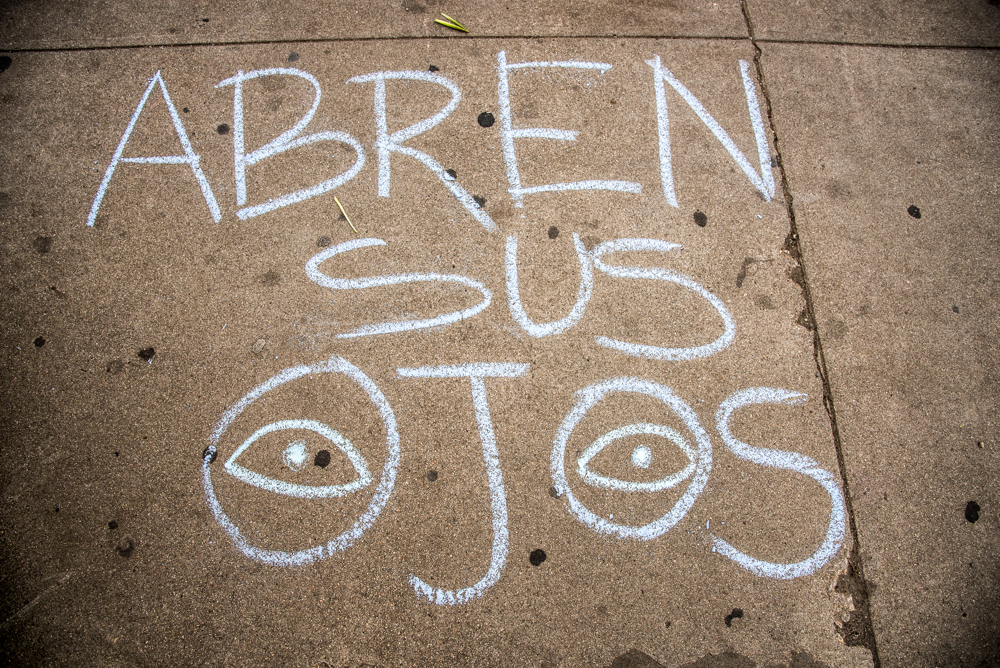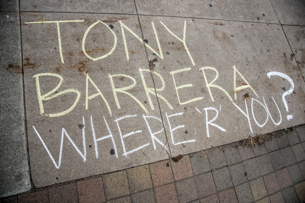 The May 9 vigil was held in front of the Mi Pueblo Market on Alisal, near where Hernandez was killed. Individuals wrote a variety of messages in colored chalk on the sidewalk. One message posed the question: "Tony Barrera - Where are You?"