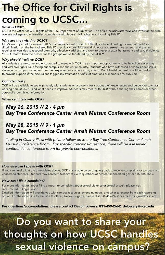 UC Santa Cruz is currently under investigation by the US Department of Education's Office for Civil Rights (OCR) for mishandling reports of sexual violence. OCR will be visiting campus Wednesday, May 27 and Thursday, May 28 to hear from students regarding how sexual violence reports are handled by the UCSC administration. This is an important time in our campus history to create effective change.