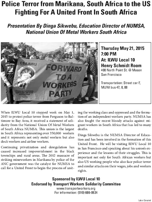 When ILWU Local 10 stopped work on May 1, 2015 to protest police terror from Ferguson to Baltimore to the Bay Area, it received a statement of solidarity from the National Union Of Metal Workers of South Africa. NUMSA is the largest and most militant union in South Africa representing 350,000 workers including not only metal workers but also dockworkers and airline workers.