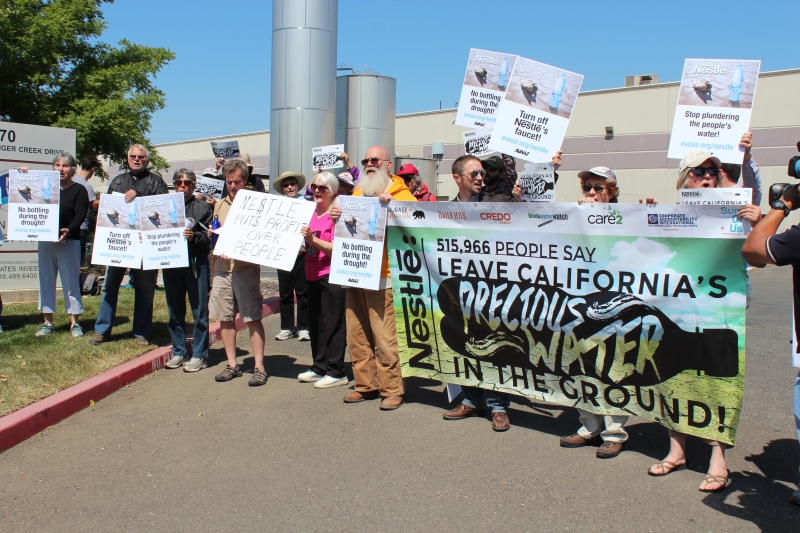 The representatives from consumer, environmental and human rights groups who participated in the protest, like at the protest in Sacramento, blasted the corporation for making millions off bottled water during the drought when urban users are seeing increasing restrictions on their water use.