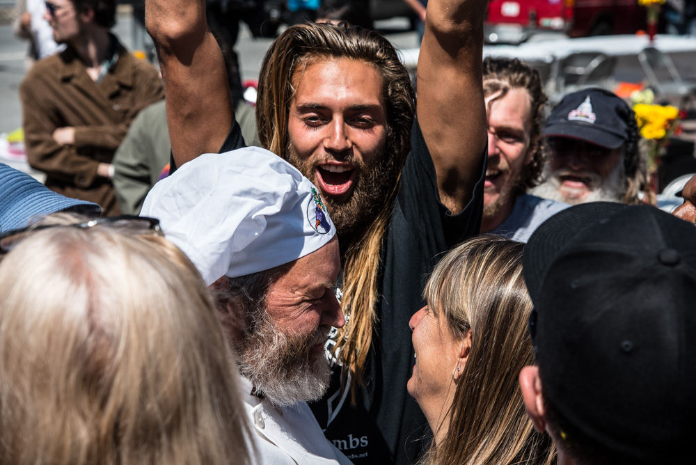 Food Not Bombs co-founder Keith McHenry was in attendance, and his birthday was also incorporated into the celebration. Food Not Bombs volunteers joined hands with other revelers to capture and roll McHenry into a giant human cinnamon bun.