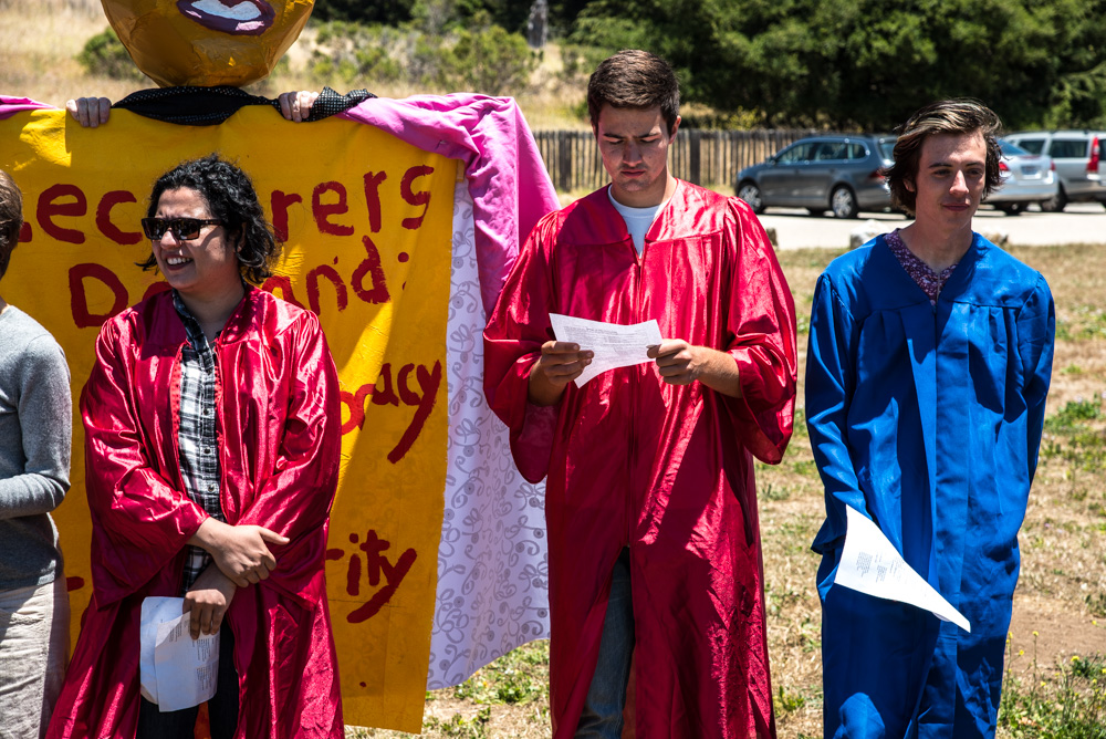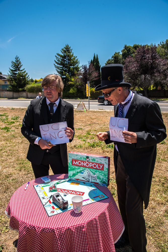After the speakers were heard, a street theater segment was performed with UC administrators portrayed as top-hat wearing characters from the Monopoly board game. Many participants were dressed in graduation gowns, and union members distributed the lyrics to a variety of songs to those in attendance so that the group could serve as the musical chorus in the skit.