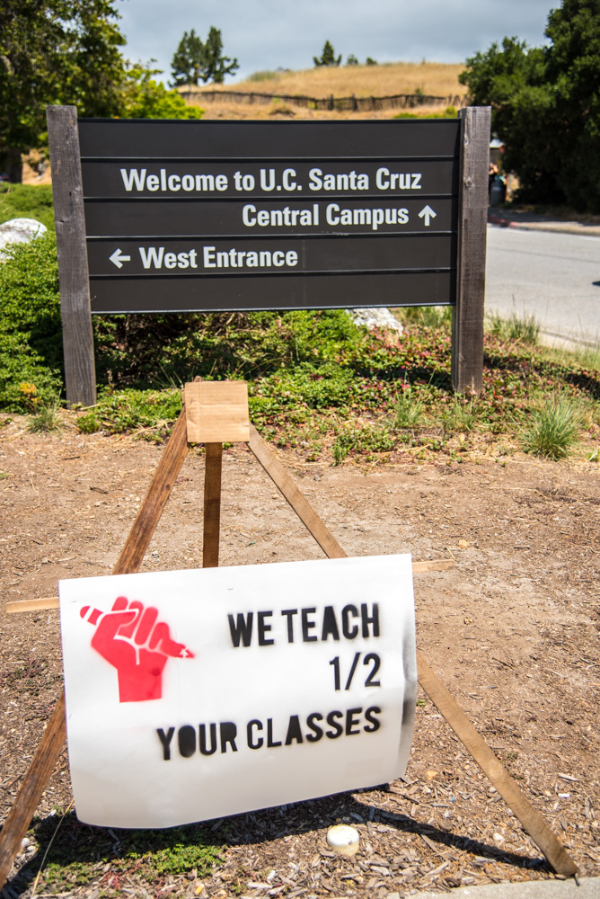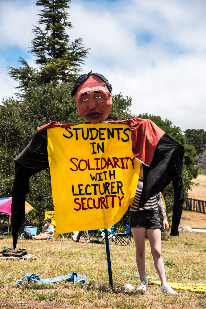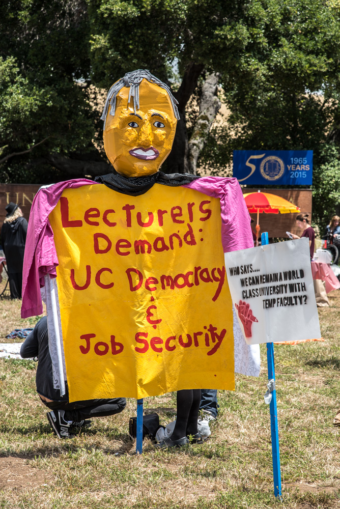 On June 1 the Lecturer's labor contract at UC Santa Cruz expired, and union members with American Federation of Teachers Local 2199 and their supporters marked the day by picketing - and picnicking - at the base of campus. Messages in support of adjunct-faculty members and a more democratized University of California system were displayed as individuals held several large, colorful puppets. Food was served, and the day-long event was dubbed "St. Precaria's Picnic."