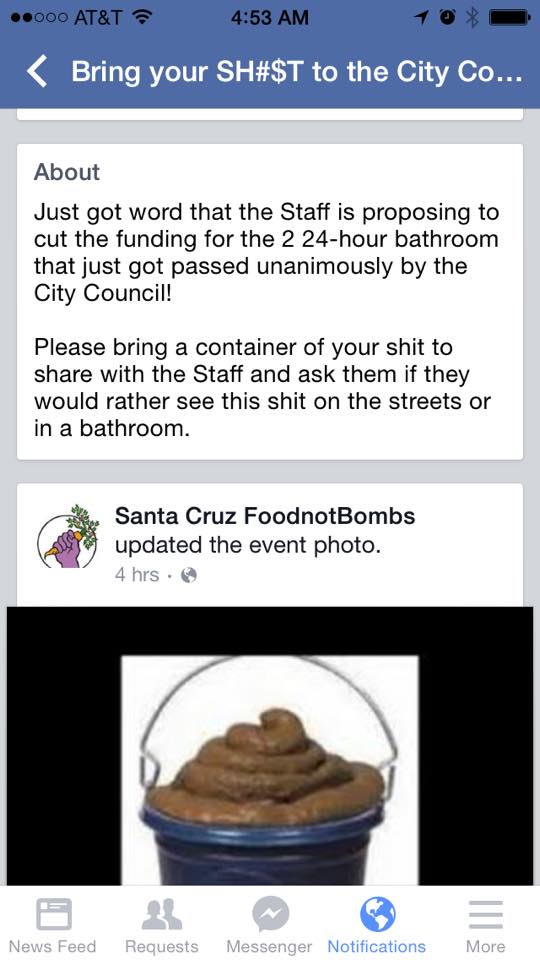 Food Not Bombs was completely mum on the issue as they ran their attack protest against HSC with veiled rhetoric. As soon as a rumor that city staff would request an alteration to the budgeting of $25K for over-night bathroom cleaning, FnB created an event on facebook featuring a bucket of shit as they encouraged people to bring their shit to city council chambers. Very strange and gross.
