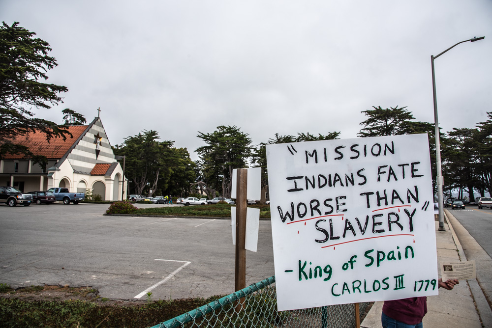 A quote from Serra himself from 1780 was displayed on one sign: "I don't see by what law or reason my Indians should be exempt from whipping," and a portion of 1779 letter from the King of Spain, Carlos III: "Mission Indians Fate Worse Than Slavery," was displayed on another.