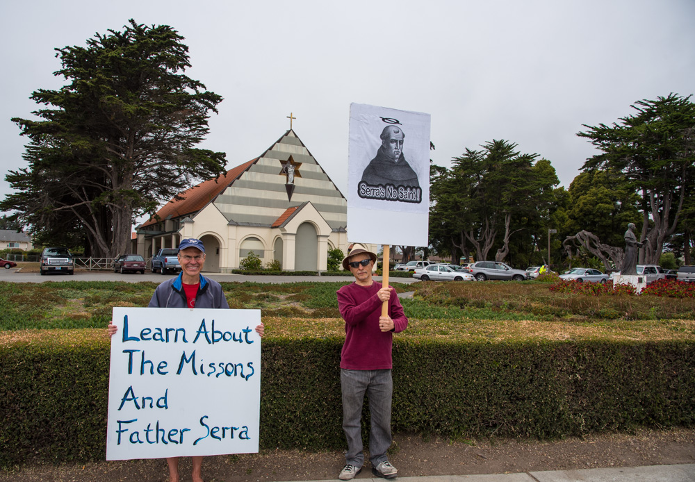 Local residents rallied is Santa Cruz on June 14 to oppose the Catholic Church's plans to canonize Junipero Serra this September, which was approved by Pope Francis. Serra presided over the brutal California mission system during its founding in the 18th century. The purpose of the rally was to educate the public about the Native American lives that were lost at the missions and the torturous conditions that were imposed there, as well as to encourage community members to contact Priests and other religious and spiritual leaders, including the Pope, in order to attempt to change his mind about granting Serra sainthood.