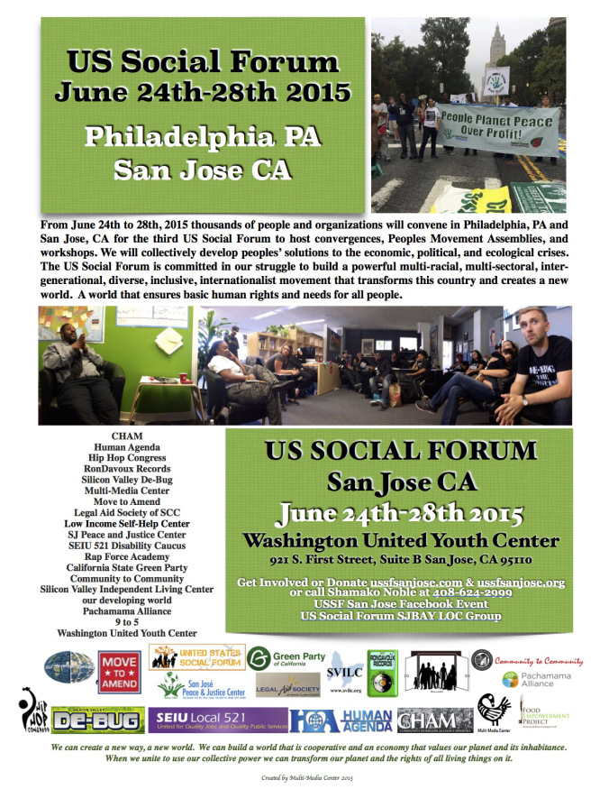 From June 24th to 28th, 2015, thousands of people and hundreds of organizations will convene in San José and Philadelphia for the third U.S. Social Forum. The Forum will host convergences, People's Movement Assemblies, workshops, film festivals, and cultural performances.