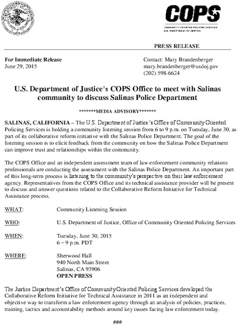 SALINAS, CALIFORNIA – The U.S. Department of Justice’s Office of Community Oriented Policing Services is holding a community listening session from 6 to 9 p.m. on Tuesday, June 30, as part of its collaborative reform initiative with the Salinas Police Department. The goal of the listening session is to elicit feedback from the community on how the Salinas Police Department can improve trust and relationships within the community.