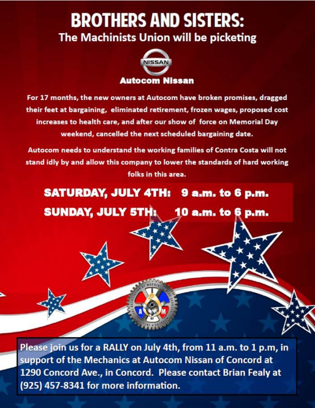 July 4 Protest Of IAM District 190/Local 1584 Mechanics To Stop Union Busting At Nissan Dealership In Concord "No Technicians without Representation"