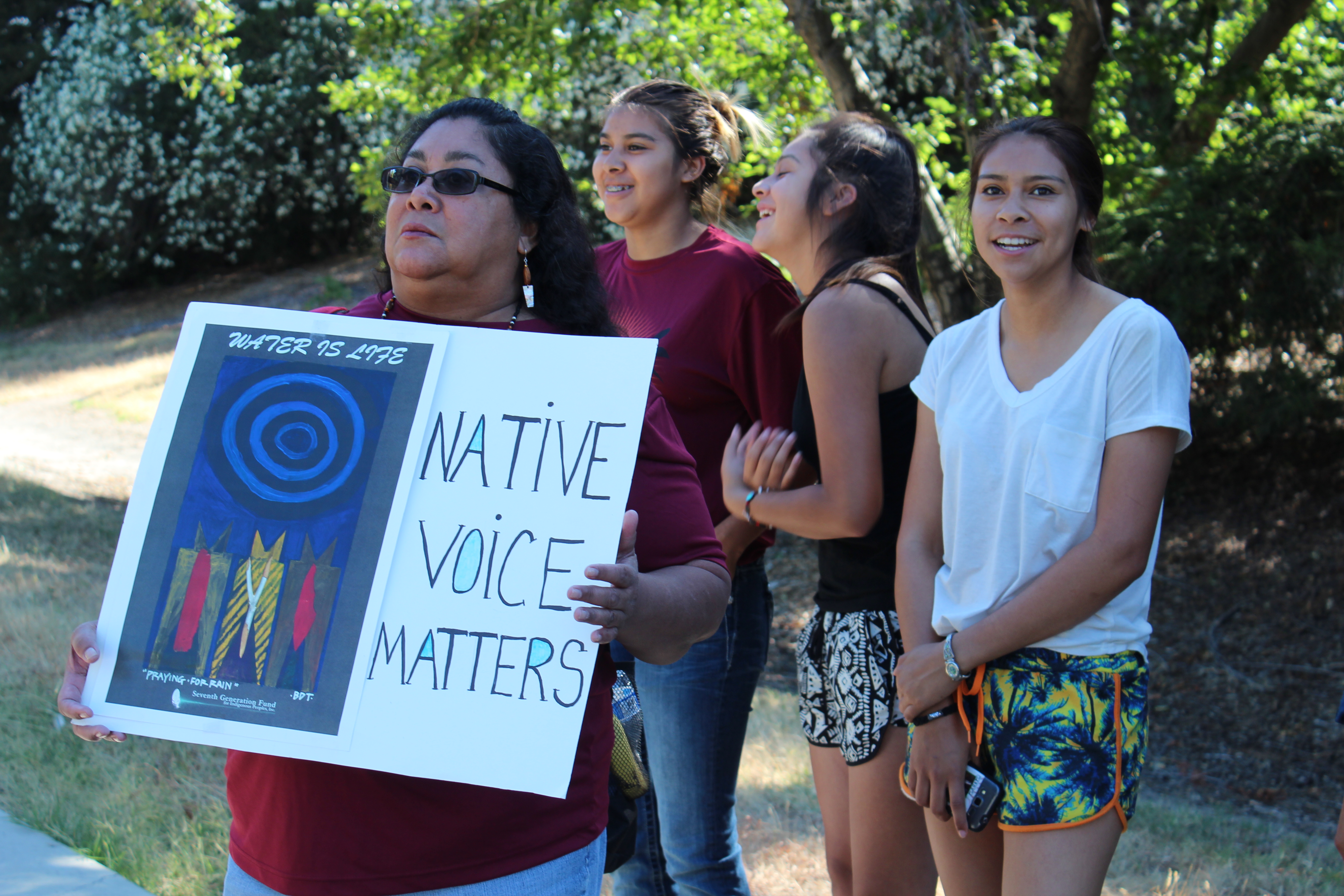 Members of the Concow Maidu, Miwok, Hoopa Valley, Pomo, Wailaki and other tribes and Native Hawaiian groups joined with local activists as they shouted, “Water is sacred, water is life, protect the salmon, protect water rights.”