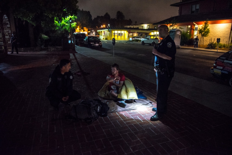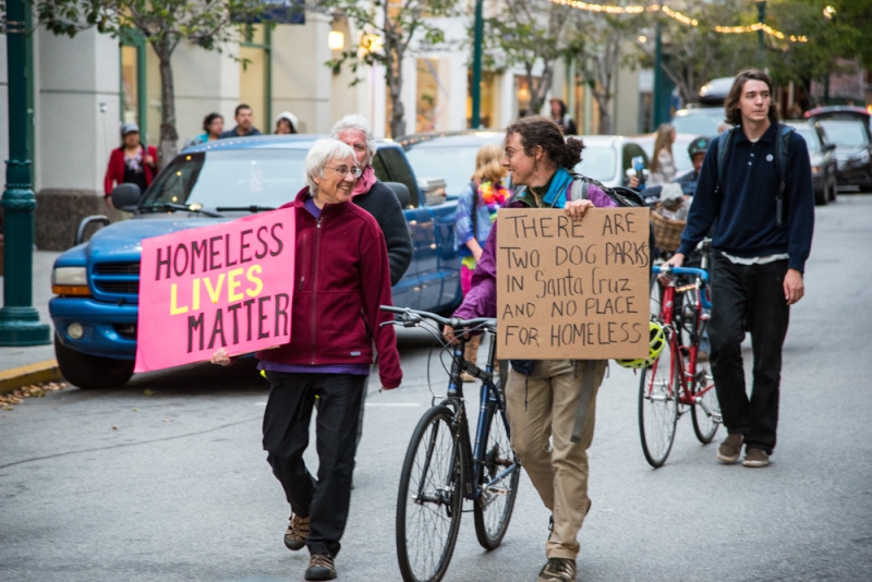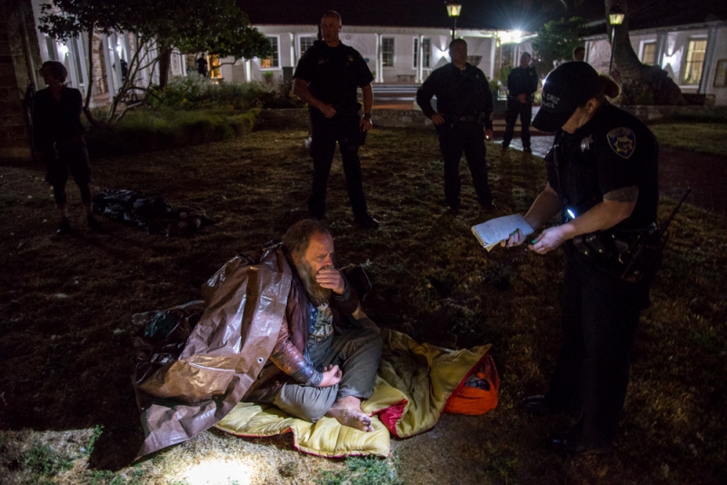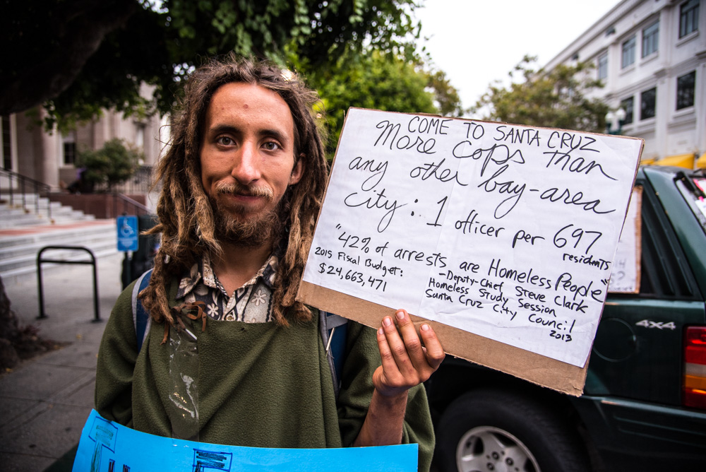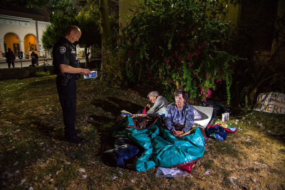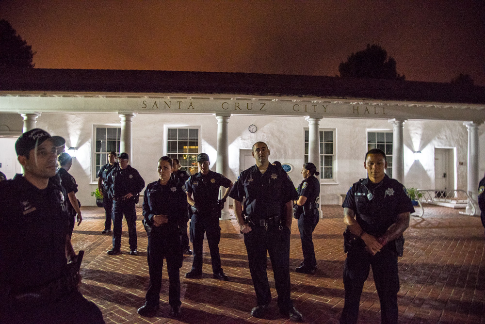 On July 4, community members in Santa Cruz held a public campout at Santa Cruz City Hall, but it was quickly cut short by police at about 1am. The campout was organized in response to the recent reduction of services at the Homeless Services Center that occurred due to a funding deficit, as well as to protest local laws that criminalize sleeping outdoors. [Top photo: Police issue citations to clear the community campout from Santa Cruz City Hall. Scroll down for more photos.]