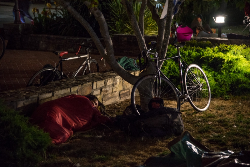 After their arrival, about 25 people set themselves up to sleep in various locations around City Hall's courtyard. Some snuggled into free sleeping bags, and others ate peanut butter and jelly sandwiches, both of which were provided by the organizers.