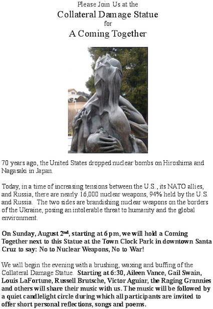 We will begin the evening with a brushing, waxing and buffing of the Collateral Damage Statue. Starting at 6:30, Aileen Vance, Gail Swain, Louis LaFortune, Russell Brutsche, Victor Aguiar, the Raging Grannies and others will share their music with us. The music will be followed by a quiet candlelight circle during which all participants are invited to offer short personal reflections, songs and poems.