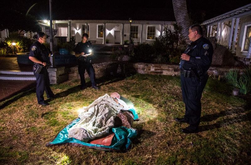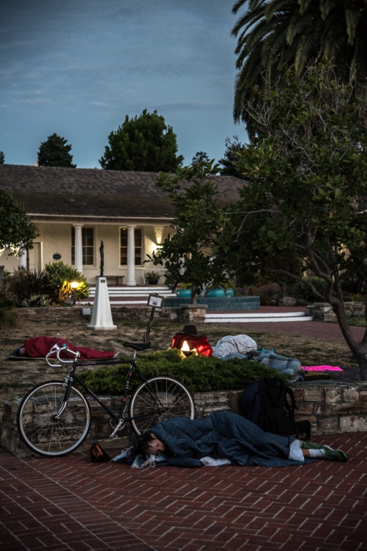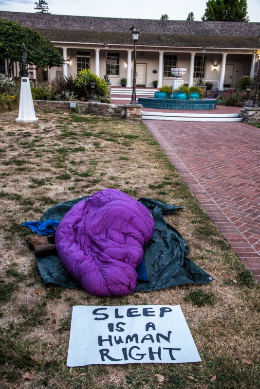 On Sunday night members of local homeless rights organizations held their second community campout at Santa Cruz City Hall. Making it through the entire evening at City Hall was no easy task for the group, which was comprised of some individuals who have homes of their own to sleep at and some who do not. The campers wrangled with Santa Cruz police, who rousted them out of their sleep spots in the City Hall court yard at 1am after insisting the area be vacated. Many, however, returned to their spots after the police left, and most were able to sleep through to the morning hours. Group sleepouts have been organized in Santa Cruz to call attention to local laws that render it a crime to sleep outdoors in public, and are also a response to the drastic cuts to day-services that occurred at the Homeless Services Center in June.