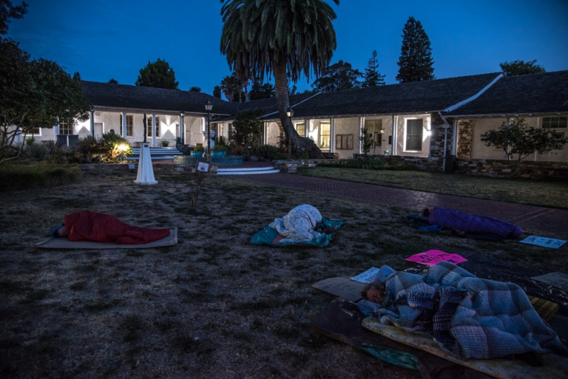 The July 19 sleepout began with a march through downtown Santa Cruz where activists carried a portable shower stall to show it off to the public. After arriving at City Hall about two dozen individuals set up places to sleep shortly before sunset, and a table was set up where free vegan sandwiches were served.