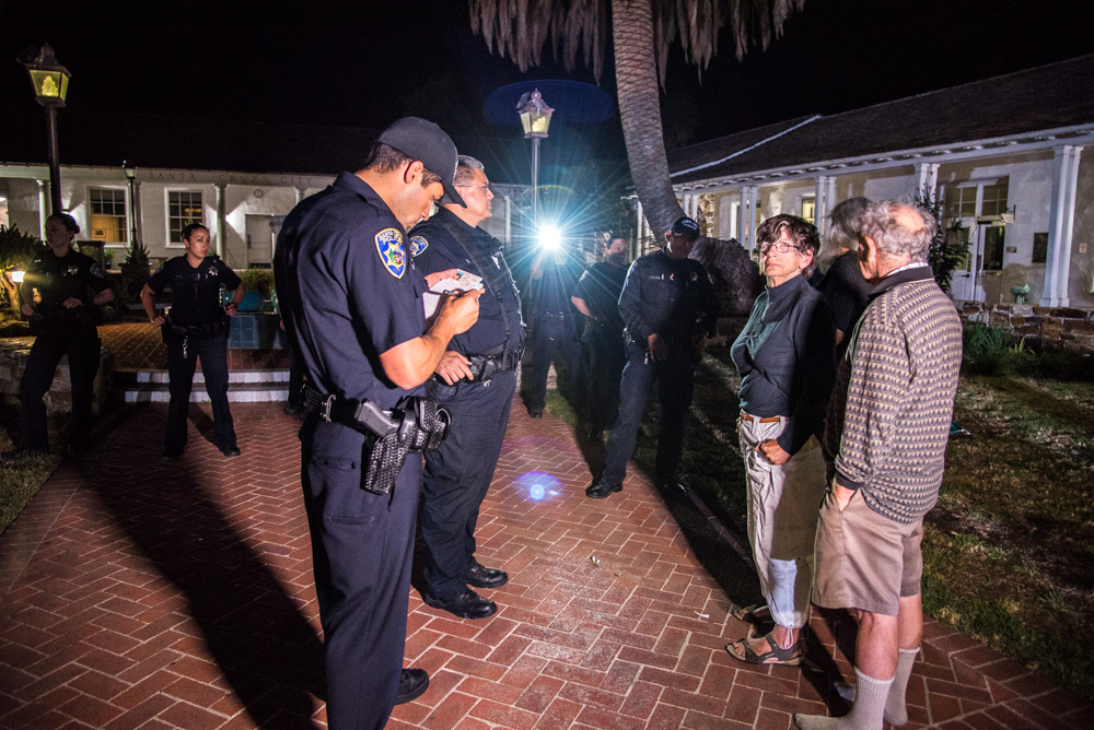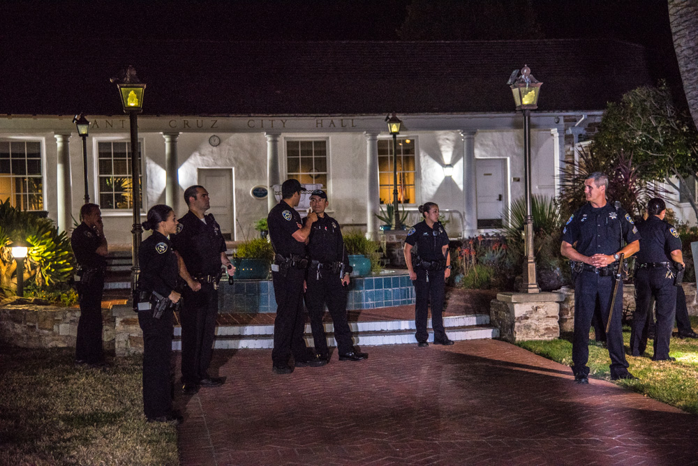 The 1am visit by Santa Cruz police on July 19 was initiated by a call from a First Alarm guard on patrol. The call resulted in the arrival a half-hour later of a squad of a dozen officers from the Santa Cruz Police Department, led by Lt. Bill Azua.