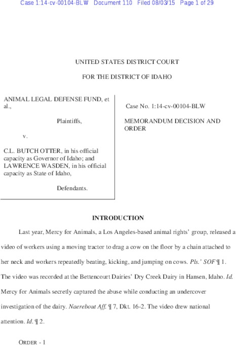 http://aldf.org/press-room/press-releases/idaho-ag-gag-law-ruled-unconstitutional-in-federal-court/