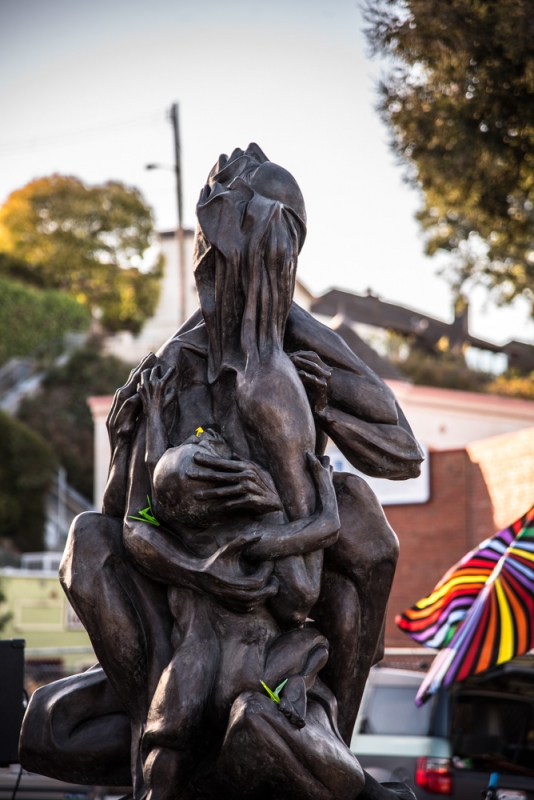 Individuals spent some time waxing and buffing the bronze Collateral Damage sculpture, in order to beautify it, and flowers were placed around its base. E.A. Chase, the artist who created it, was in attendance. As musicians played, he looked on fondly with bright, glowing eyes.