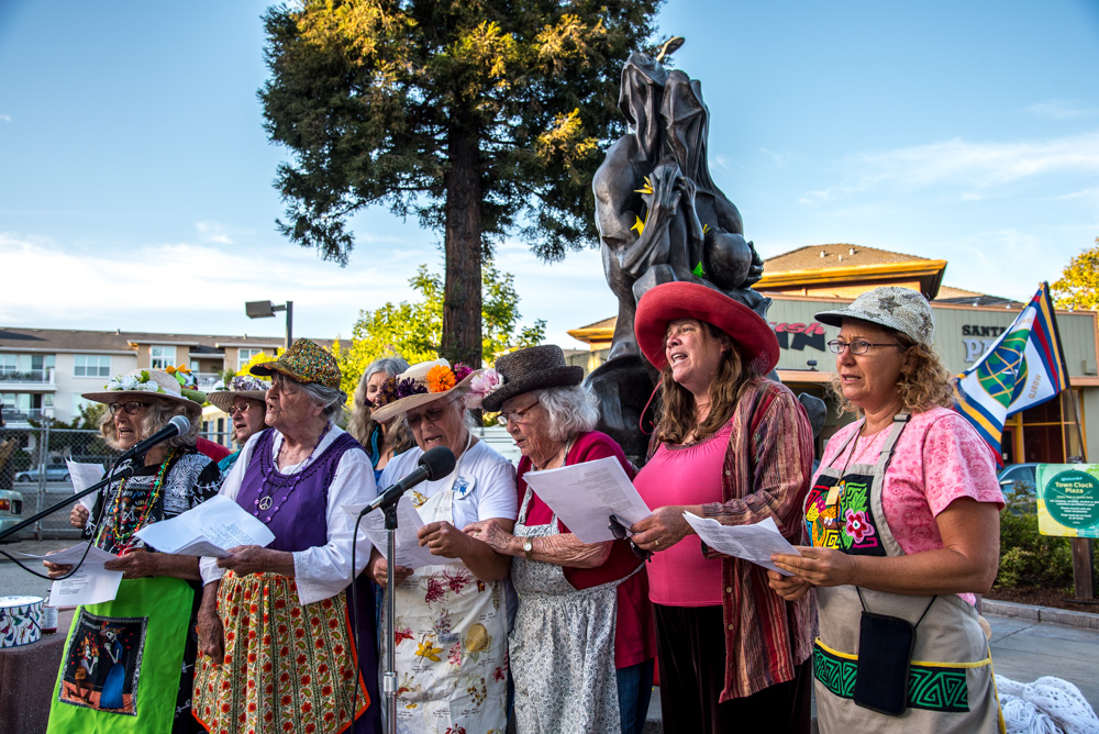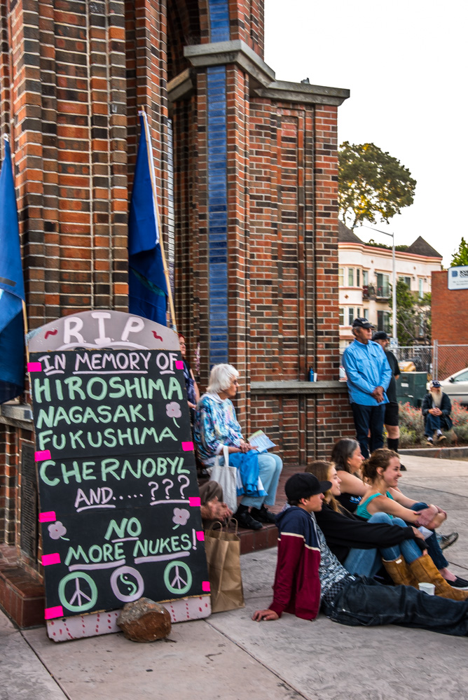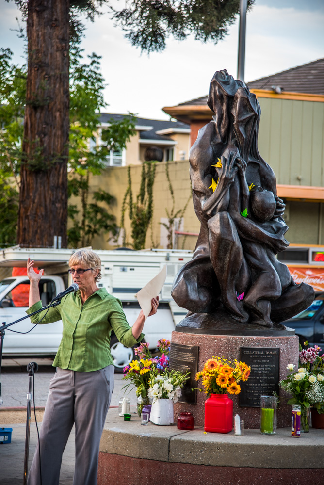 On August 2, community members in Santa Cruz came together to commemorate the 70th anniversary of the U.S. atomic bombings of Hiroshima and Nagasaki. "Let us recommit ourselves to a world without nuclear weapons and without war," an announcement for the gathering read. The evening began with musicians playing in front of the Collateral Damage statue, which was installed next to the Town Clock on the 50th anniversary of the atomic bombings as a memorial to all civilian casualties of war. After the performances, the gathering concluded with a candlelight vigil where people had the opportunity to express their thoughts.