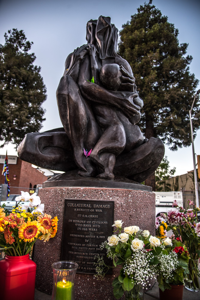The idea to create a monument in Santa Cruz that conveyed the reality of war and its effects on civilians was first conceived by Vietnam veteran James Wainscoat in the early 1990s. He brought the idea to the local VFW post, and the campaign to build it was launched with the Resource Center for Nonviolence. Chase's Collateral Damage sculpture was chosen and the final piece was eventually built next to the Town Clock.