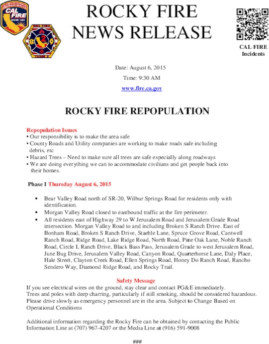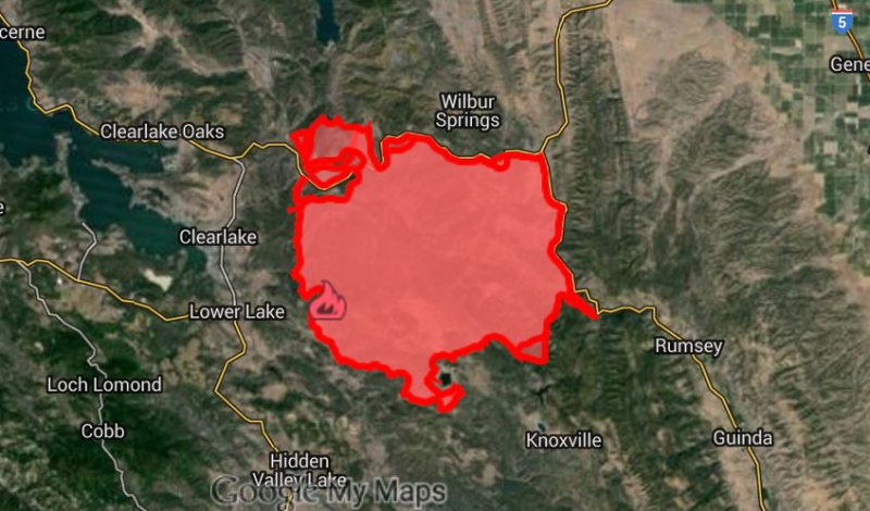 So far 43 residences, 53 outbuildings destroyed, and 8 structures damaged. Counties effected are Lake, Yolo & Colusa Counties. The Rocky Fire has forced the evacuation of 1,480 people, and at least 13,000 have been asked to vacate their properties.