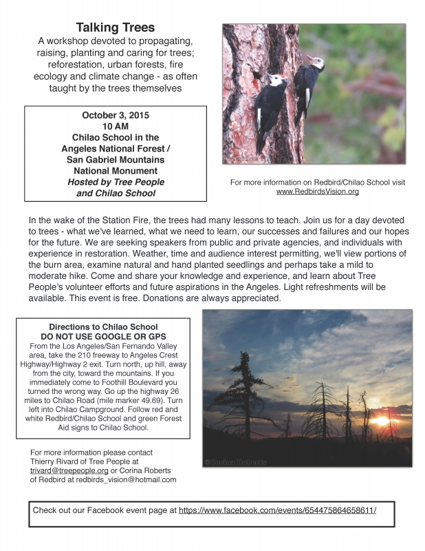 We are very excited about this workshop and encourage everyone who has an interest int he health and well being of trees and forests to attend. This will be an unparalleled learning opportunity, with guest speakers who have earned their knowledge hands on, including Johann Michael Lockard, Los Angeles County Fire, Forestry Division, Johann Melissa Lockard, Antelope Valley Resource Conservation District, Thierry Rivard, Roger Klemm, Corina Roberts and others. This event is free; there will be a potluck style lunch with Redbird providing a main dish, drinks and snack items; contributions from guests are welcome but not required.
