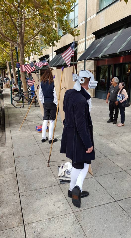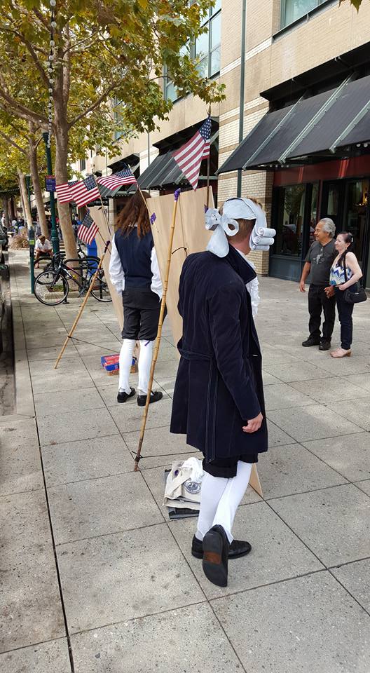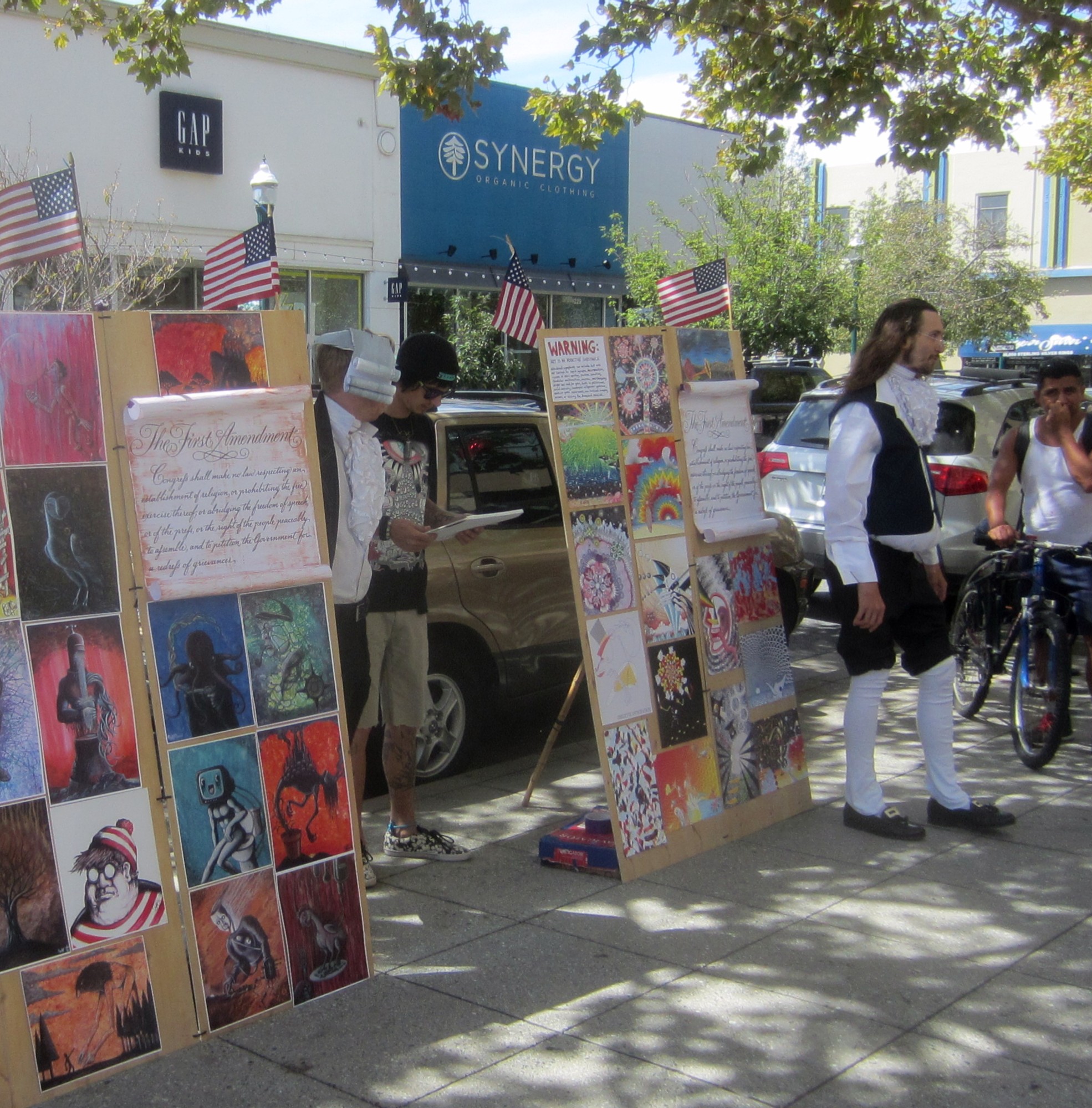 On Sunday they returned dressed in Colonial dress with a display of their artwork and a display of the First Amendment.