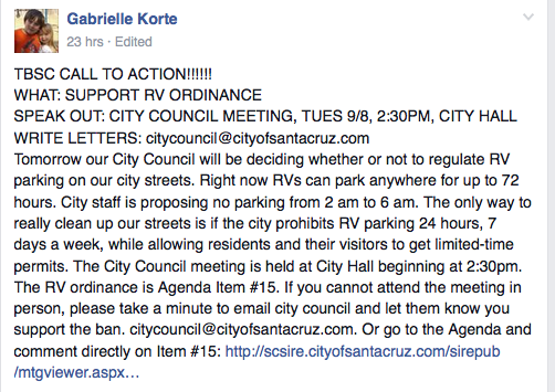 Take Back Santa Cruz (TBSC) Targets Homeless RV Dwellers 8/8/2015 Santa Cruz City Council