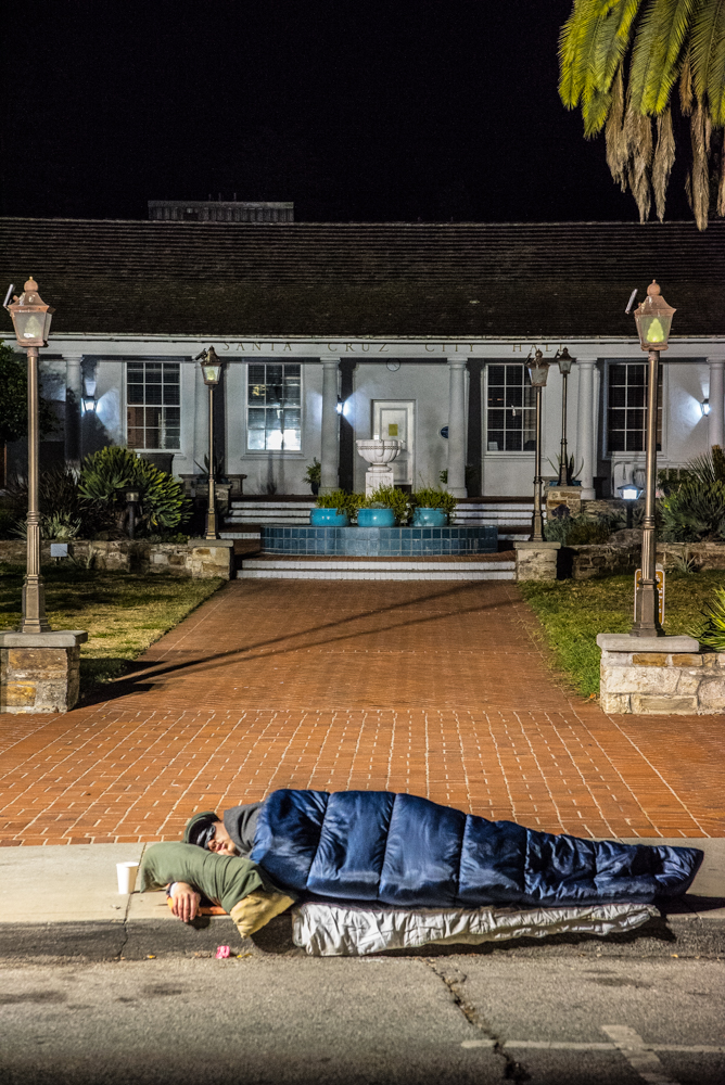 On September 22 community members protesting the criminalization of homelessness in Santa Cruz returned to city hall for their eleventh sleepout. A sizable group again made it through a night of sleep at city hall, though Santa Cruz police woke everyone up as a group at about 5:30am. The next sleepout is tonight, September 29, at Santa Cruz City Hall.