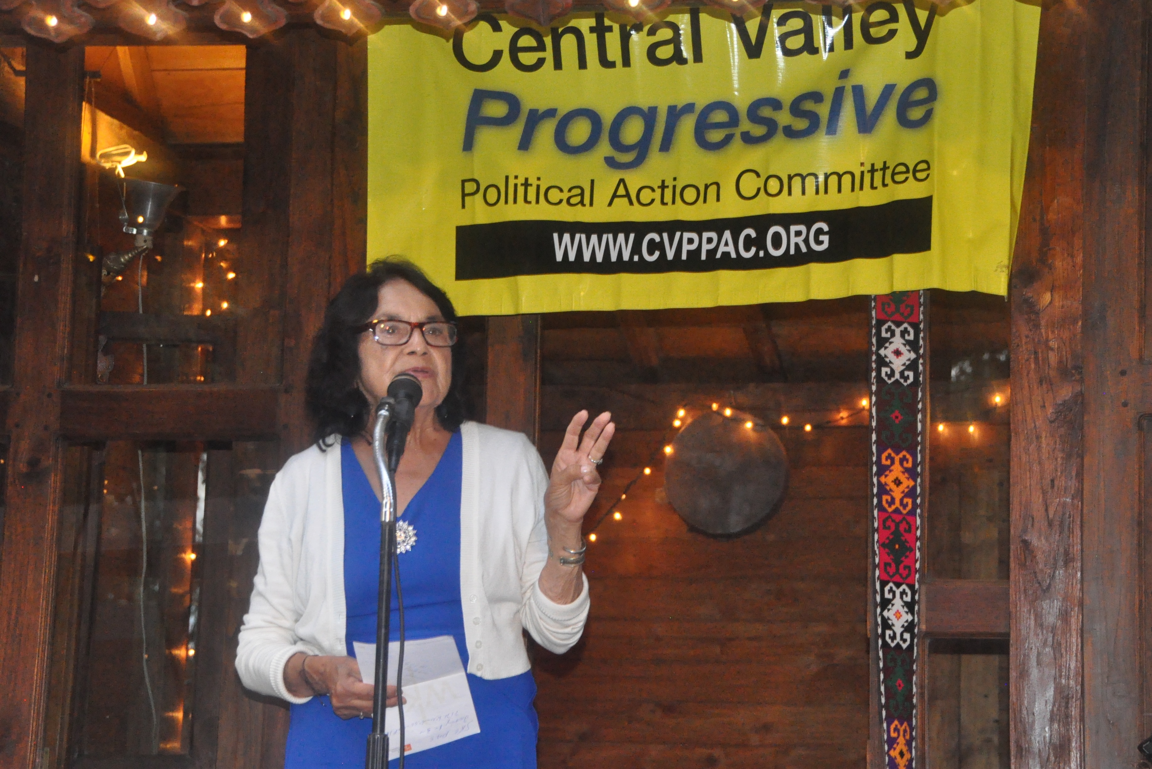 In her speech, Huerta said, “We’ve got to learn how to do this work at the grassroots level so we can get (progressives) on those school boards, get on the City Councils, get good people elected to the state legislature and Congress.” She continued, “Some people used to say, back in the 60s and 70s, that if you want to get ahead you have to leave the Central Valley. Well, you know what? Some of us have to stay here and fight for social justice. You know, this is not a poor area. Our people are poor because all of the money is on the top, and none of that money gets down to the working people and the people who really create the wealth in the Central Valley.”