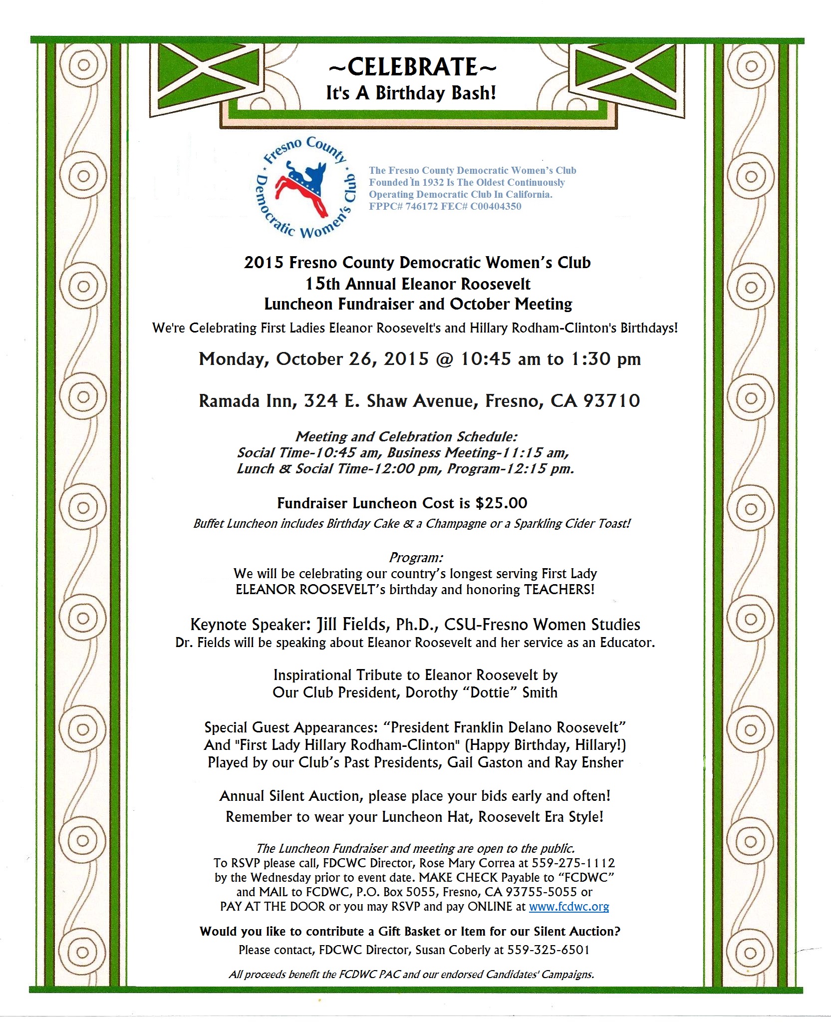 Join us for the 2015 Fresno County Democratic Women’s Club 15th Annual Eleanor Roosevelt Luncheon Fundraiser and meeting on Monday, October 26, 2015 from 10:45 am to 1:30 pm at Ramada Inn, 324 E. Shaw Ave., Fresno, CA 93710 (at Shaw Avenue and CA HWY 41). Fundraiser cost is $25.00 (Buffet Luncheon includes birthday cake and champagne or sparkling cider toast!) It's a Birthday Bash! We're Celebrating First Ladies Eleanor Roosevelt and Hillary Rodham-Clinton's Birthdays!
