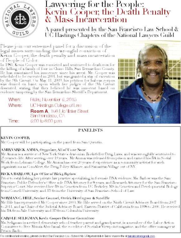 Please join our esteemed panel for a discussion of the legal issues surrounding the wrongful conviction of Kevin Cooper, the death penalty and mass incarceration of People of Color.