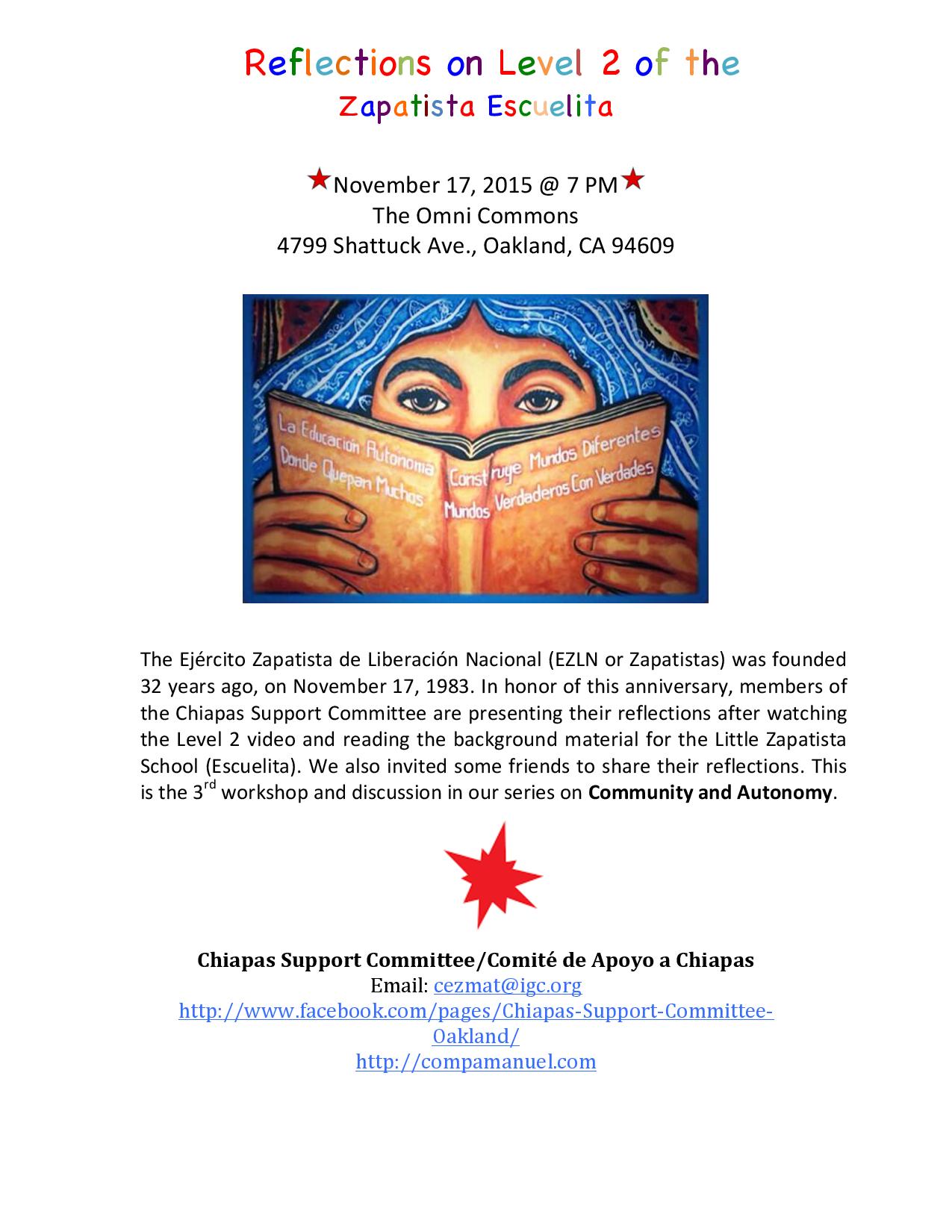 The Zapatista National Liberation Army was founded on November 17, 1983. In honor of this anniversary, members of the Chiapas Support Committee are presenting their reflections on the Level 2 video and reading the background material for the Little Zapatista School (Escuelita). We also invited some friends to share their reflections. This is the 3rd workshop and discussion in our series on Community and Autonomy.
