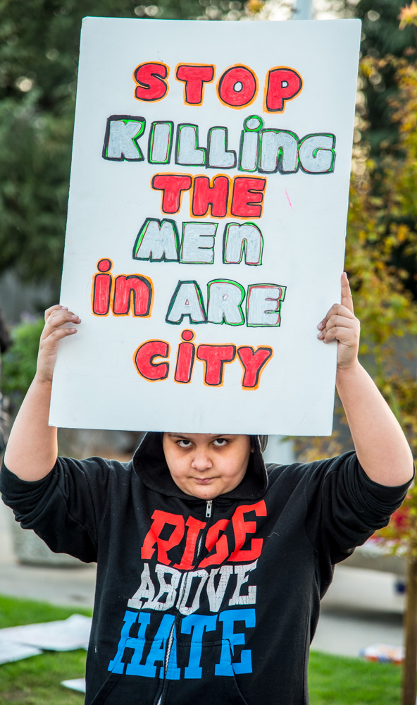 To mark the National Day of Protest Against Brutality, community members in Salinas rallied in front of city hall on October 22, where the family members of Jose Velasco, Frank Alvarado, and Angel Ruiz all spoke. Ruiz and Alvarado were among five unarmed Latino men killed in separate incidents in 2014 during encounters with the Salinas Police Department. Velasco was severley beaten by a group of Salinas police officers in 2015. Individuals held signs in front of city hall and joined in several group chants, including energetic repetitions of the phrase "Brown Lives Matter" and choruses of "Hey Hey, Ho Ho, Chief McMillin has got to go!"