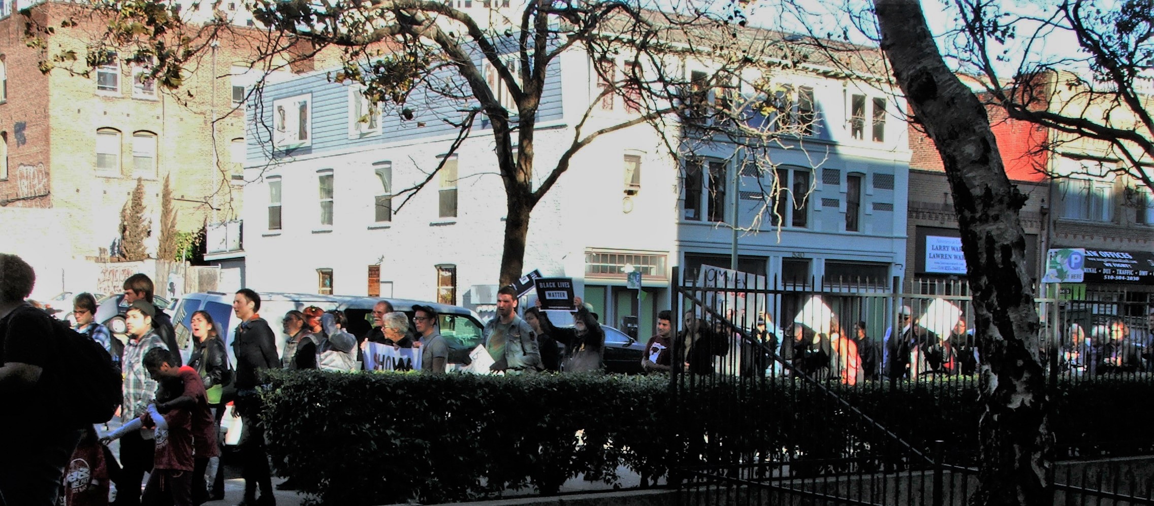 Some two hundred energized protesters gathered at 1:30 PM outside D. A. O'Malley's offices, which are located in the Wiley W. Manuel Courthouse, 661 Washington Street, Oakland, CA. Speakers from unions, young leaders of the campaign to raise the Minimum Wage, and leaders from the Black Lives Matter movement, fired up the crowd. They declared that the struggles for economic justice and racial justice were two sides of the same struggle. The multiracial crowd responded with loud and spirited chanting. They repeatedly chanted optimistically, “I believe that we will win!” It was a largely youthful protest with a high energy atmosphere that was contagious.