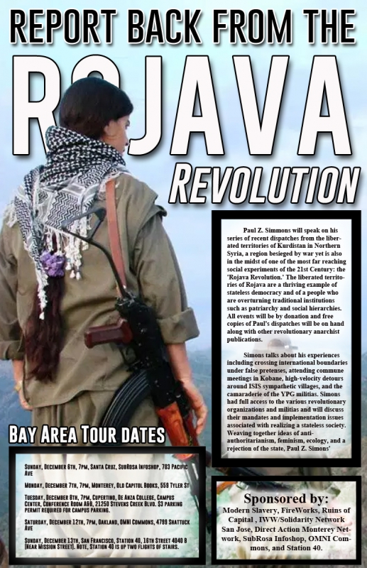 In Santa Cruz, Monterey, Cupertino, Oakland, and San Francisco, Paul Z. Simmons will speak on their series of recent dispatches from the liberated territories of Rojava in Northern Syria, a region besieged by war yet is also in the midst of one of the most far reaching social experiments of the 21st Century: the 'Rojava Revolution.' The liberated territories of Rojava are a thriving example of stateless democracy and of a people who are overturning traditional institutions such as patriarchy and social hierarchies. All events will be by donation and free copies of Paul's dispatches will be on hand along with other revolutionary anarchist publications.