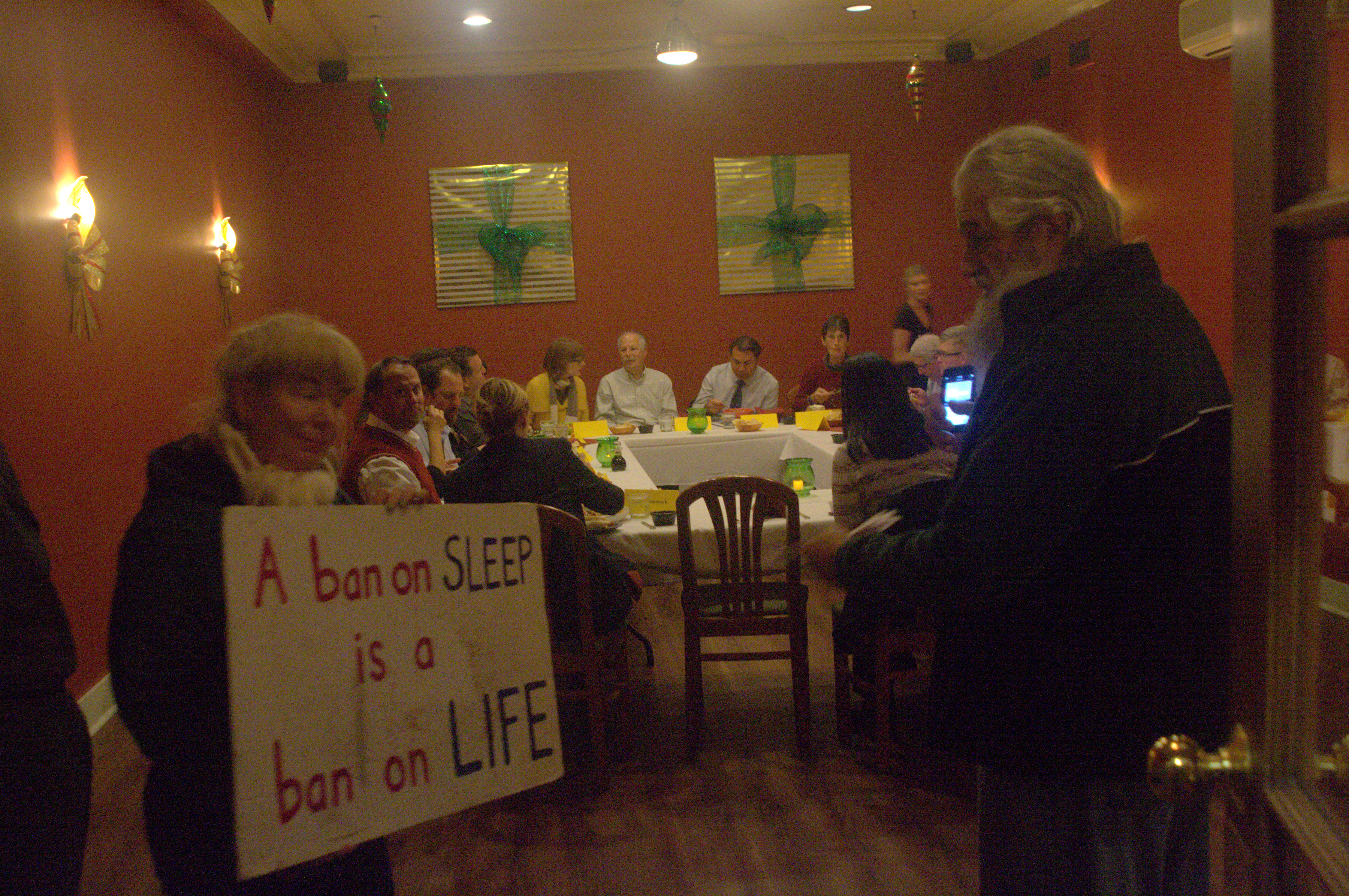 A small group of protestors also entered the banquet room during the council’s meal with a sign reading “A Ban on Sleep is a Ban on Life.” They stayed in the room for several minutes and exchanged some conversation with council members, then returned to the sidewalk to continue serving food and coffee. The group attempted to enter the banquet room a second time, but were halted by Santa Cruz police officers and told they would not be entering the room. An argument ensued between the protestors, police, and the managers of both el Palomar Restaurant and the Palomar Inn Building. Protestors maintained they had a legal right to access a meeting of city council members, while the managers insisted that they were on private property and had to leave under threat of arrest for trespassing. After a several minute stand-off, the protestors again returned to the sidewalk until the city council left the building.