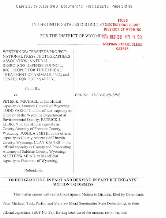 In response to the State of Wyoming’s motion to dismiss the case, Judge Scott Skavdahl issued a 38-page order in which he refused to strike the plaintiffs’ First and Fourteenth Amendment claims against the state laws, confirmed that the groups had standing to challenge the laws in court and ordered the removal of Governor Matt Meade as a defendant in the case. In evaluating the suit’s First Amendment claims, the Court noted “serious concerns and questions as to the Constitutionality of various provisions of these trespass statutes...” and wrote that the state’s arguments in favor of the law “appears to simply be a façade for content or viewpoint discrimination.”