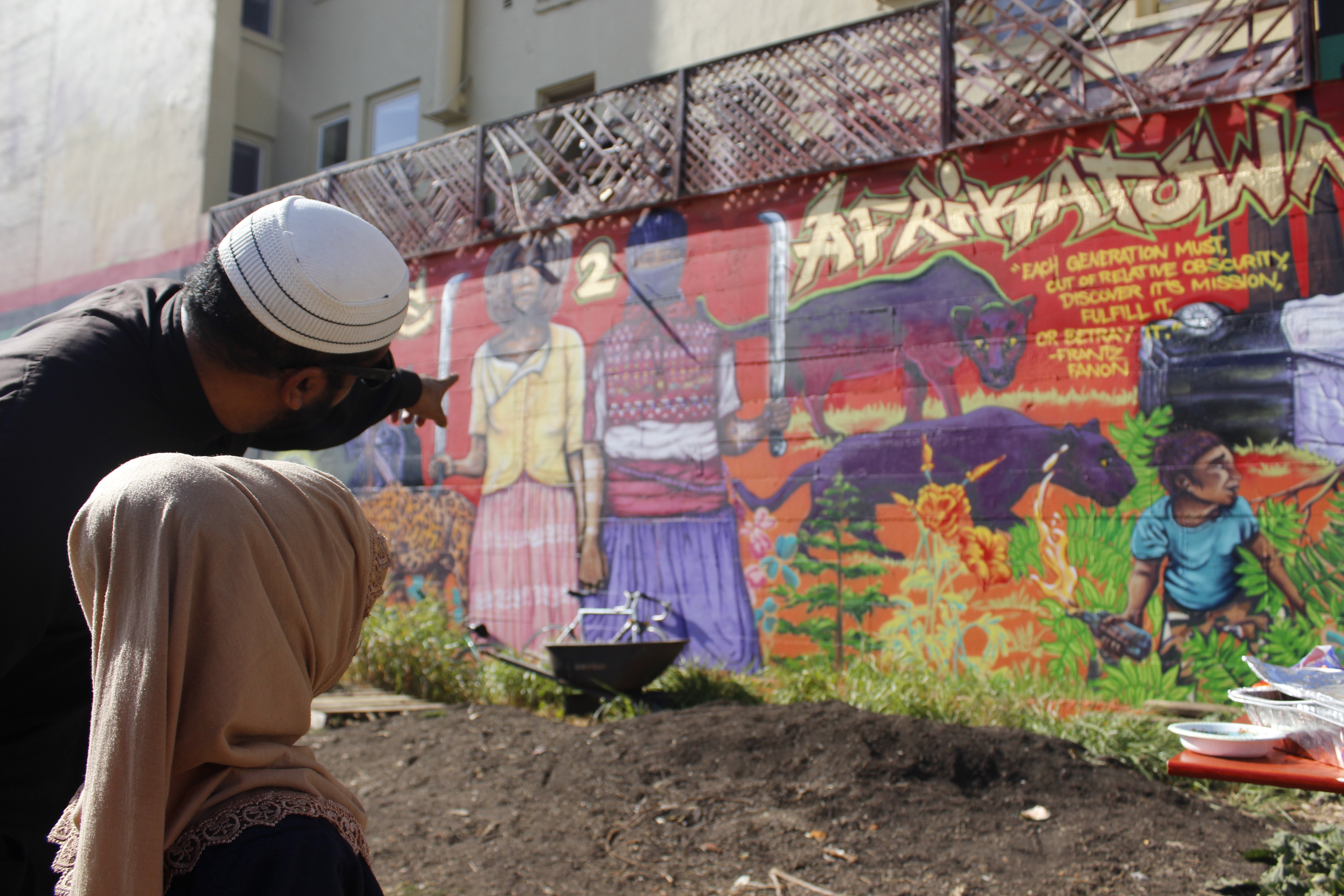 “We want this to be a resource for the community,” said Danae Martinez, a community college professor of African American Studies at Laney and Merritt Colleges. Her students there and throughout the Bay Area helped plant the garden and paint the mural. “We want it to be for Black people and for Black people.” The garden is just a seed for Afrika Town, envisioned as an autonomous zone for Black people.