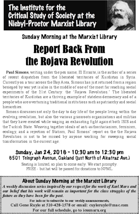 Paul Simons, writing under the pen name, El Errante, is the author of a series of recent dispatches from the liberated territories of Kurdistan in Syria. Currently on a tour across the Bay Area, Simons has just returned from a region besieged by war yet is also in the middle of one of the most far reaching social experiments of the 21st Century: the ‘Rojava Revolution.’ The liberated territories of Kurdistan are a thriving example of stateless democracy and of a people who are overturning traditional institutions such as patriarchy and social hierarchies.
