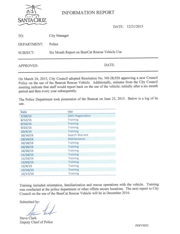 Santa Cruz Police misled the public when they first asked the Santa Cruz City Council for permission to purchase the attack vehicle in December of 2014. SCPD didn't follow the city's standard procedure for grant allocation requests and city staff attempted to slip the request past the public by placing it on the council's consent agenda, which is normally reserved for non-controversial items. The public was not fooled and responded with massive protests at the next several city council meetings, prompting the council to re-review the issue.